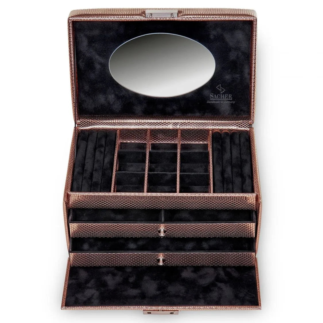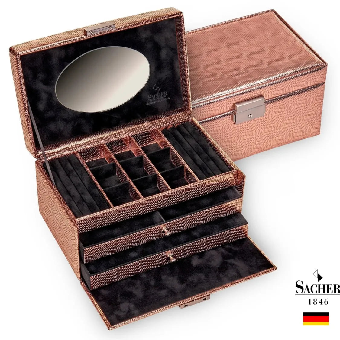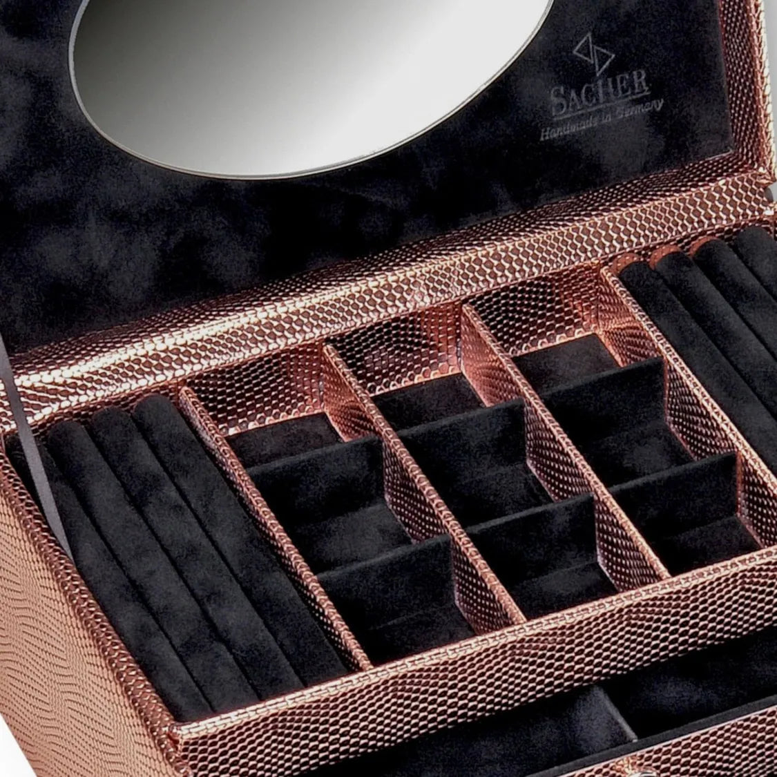 Avaa tämä upea Kiiltävä Korulaatikko painikkeella ja löydät ensimmäisen tilavan lokeron, joka on vuorattu ylellisellä Palatine Velvet -sametilla. Laatikon sisältä paljastuu 9 pientä neliön muotoista lokeroa (noin 35x35 mm), jotka ovat täydellisiä korvakoruille ja pienille koruille. Lisäksi löydät 2 erillistä rengaslokeroa sormuksillesi sekä 2 vetolaatikkoa, joista toinen on jaettu kahteen osastoon isompia koruja varten. Mitat ovat ihanteelliset: leveys 22 cm, pituus 14 cm ja korkeus 11,5 cm - kompakti mutta tilava. Turvallisuutta ja käytännöllisyyttä lisäävät hopeanvärinen avainlukko sekä tukeva kahva, joka tekee laatikosta täydellisen matkakumppanin. Korulaatikon sisäkanteen sijoitettu peili viimeistelee tämän laadukkaan tuotteen toiminnallisuuden.
