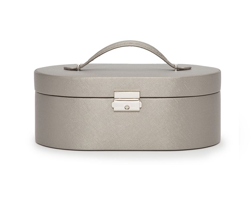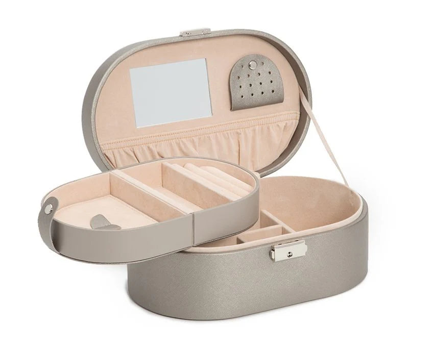 Tämä pieni matkakorulaatikko kermaisen täydellisellä sisustalla on suunniteltu vastaamaan kaikkiin korujen säilytyksen tarpeisiisi. Sen kompakti 19 cm x 11 cm x 11 cm koko tekee siitä ihanteellisen matkoille, mutta riittävän tilavan arjen käyttöön. Valitse harmaa tai musta tekonahkapinta – molemmat sävyt korostavat sisäpuolen kermanväristä mokkasisustaa luoden harmonisen kokonaisuuden. Vain 0,45 kg painava pieni matkakorulaatikko kulkee vaivattomasti mukanasi minne tahansa. Sen kätevä peili mahdollistaa korujen sovittamisen missä tahansa, ja tilavaan A-lokeroon mahtuvat isommatkin korut. Kahdessa erillisessä pidikkeessä säilytät helminauhasi ja kaulakorusi solmuttomina – kermainen sisusta suojaa arvokkaita korujasi naarmuilta ja kolhuilta.